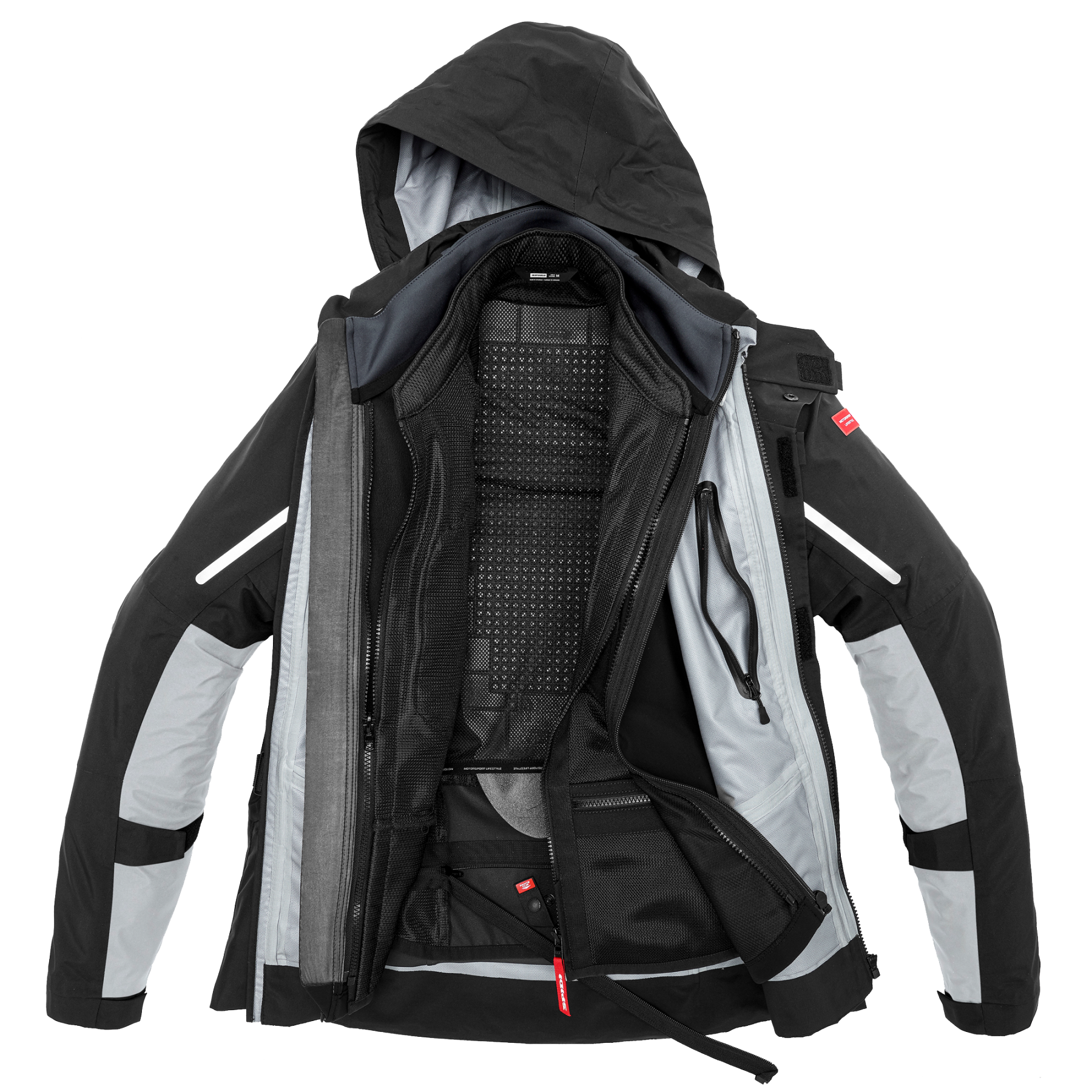 - Equipamiento de protección para motociclistas en hombros, codos / opcional: espalda (no incluida) conforme a la directiva UE/89/686/ECC.